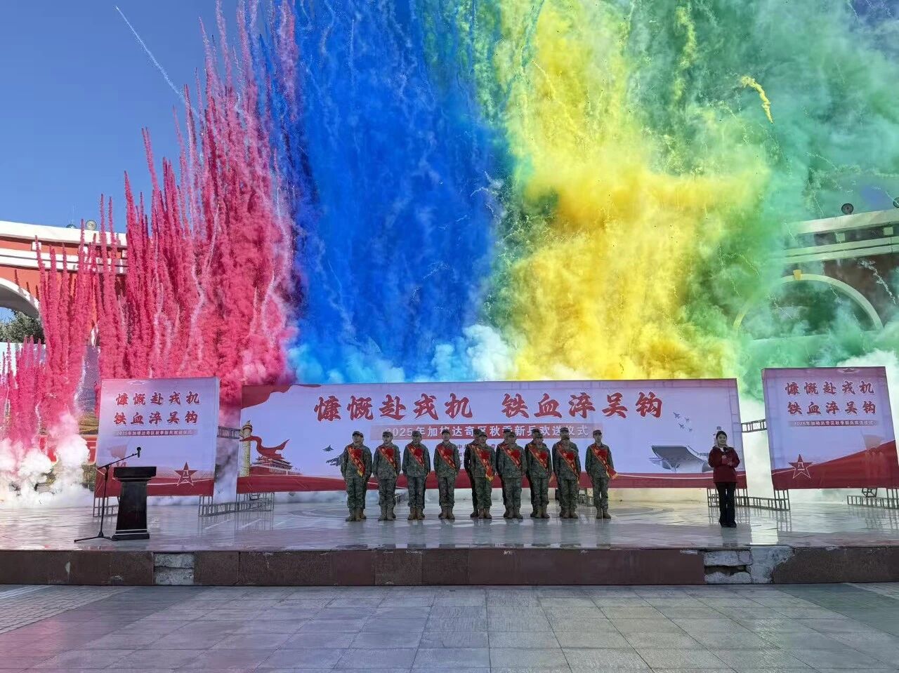 仪式在《中国人民解放军军歌》的激昂旋律中走向高潮,全体人员再次起立,放声歌唱。最后,伴随着《强军战歌》的奏响,彩烟、彩条腾空而起,烟花绚烂绽放,为新兵们的军旅征程送上最热烈的祝福。