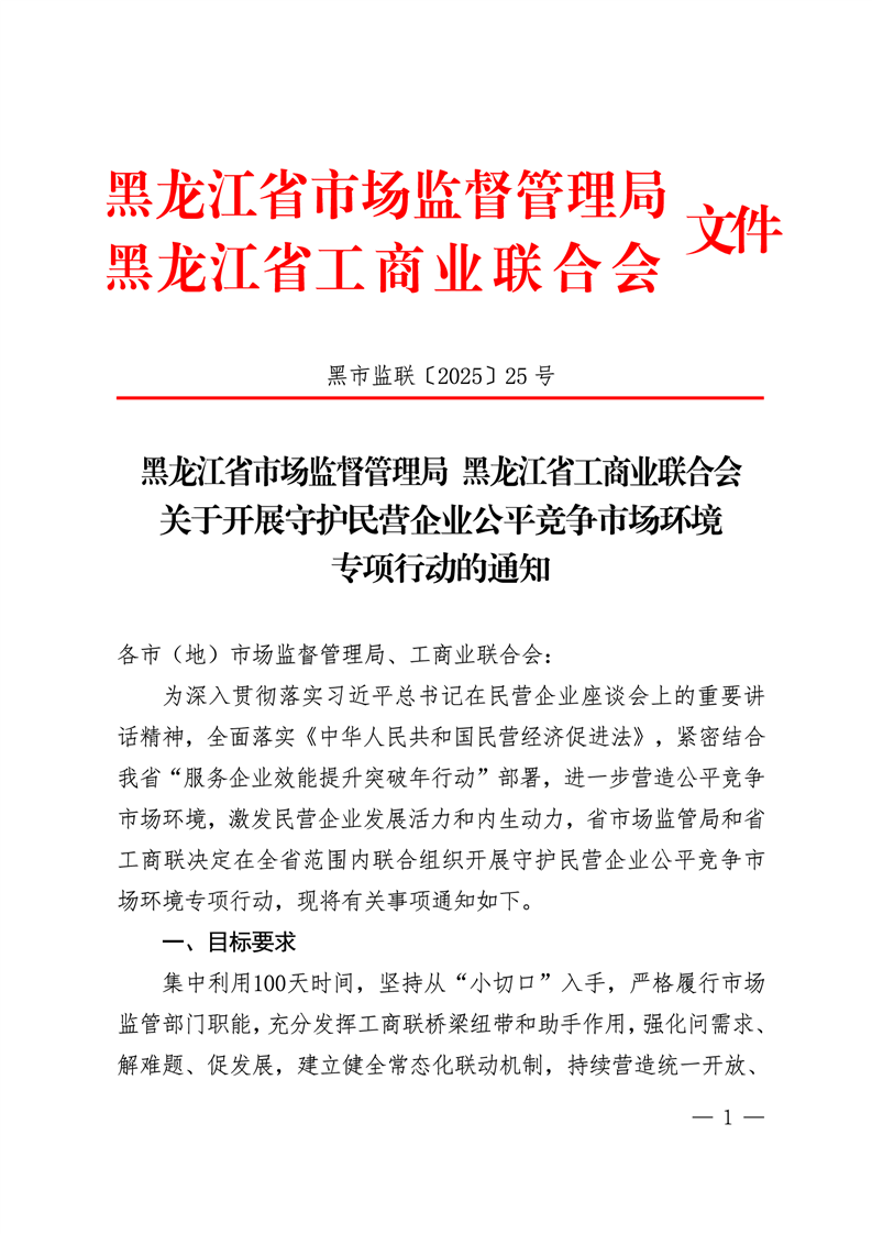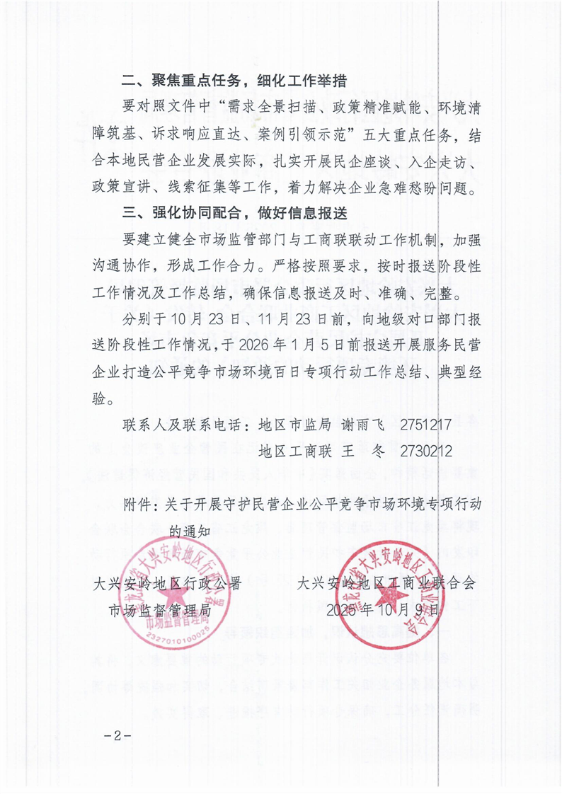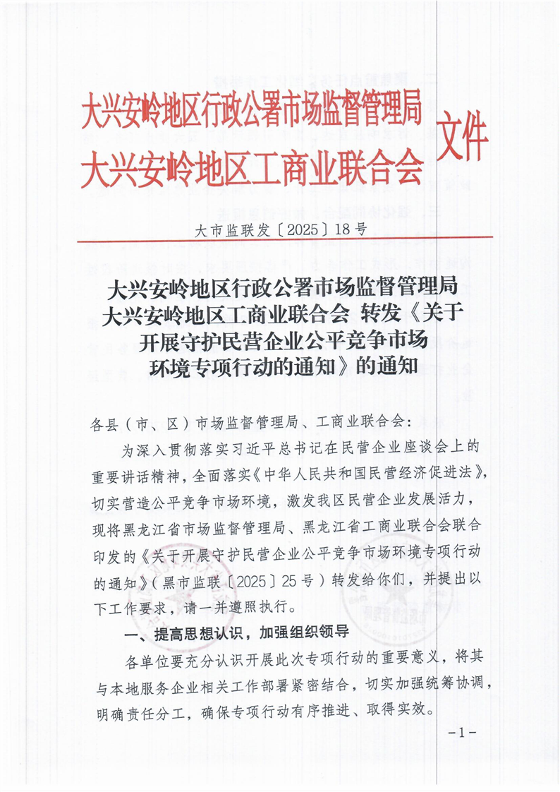 大兴安岭地区行政公署市场监督管理局大兴安岭地区工商业联合会转发《关于开展守护民营企业公平竞争市场环境专项行动的通知》的通知