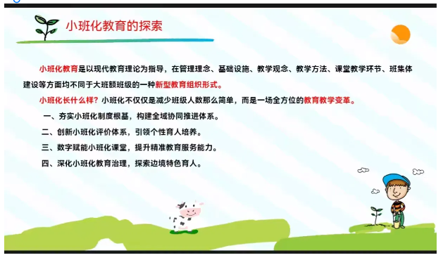 在培训中,金主任强调小班化教育的核心理念是“因材施教、面向每一位”,绝非简单减少班级人数。她通过真实的教师心声分享——“从前批改作业需2小时,如今1小时20分钟即可完成,结余时间能专注设计个性化任务”“沉默的孩子开始主动举手,因为不再有‘藏在人群中’的安全感”,让在场教师深刻感受到小班化带来的教学变革与学生成长。