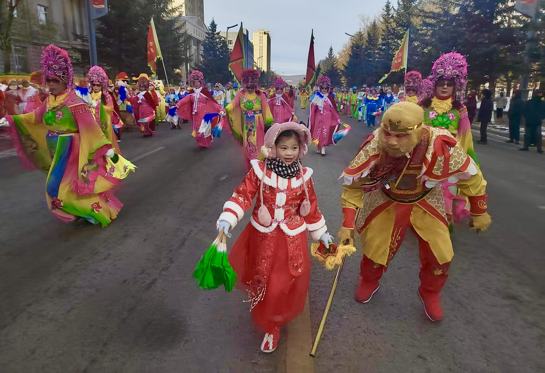 长虹镇秧歌队有近百人,队员们身着整齐队列,迈着矫健有力的步伐,和着铿锵激昂的鼓点,红、绿、粉、黄等五彩斑斓的秧歌服竞相争艳,手中翻飞的彩扇似跳跃的火苗,在冬日寒风中燃动热情。队伍里,西游记经典人物扮相滑稽俏皮、妙趣横生,稚嫩可爱的儿童秧歌队员萌态尽显,满是童真,为山城人民送上最真挚的新春祝福。